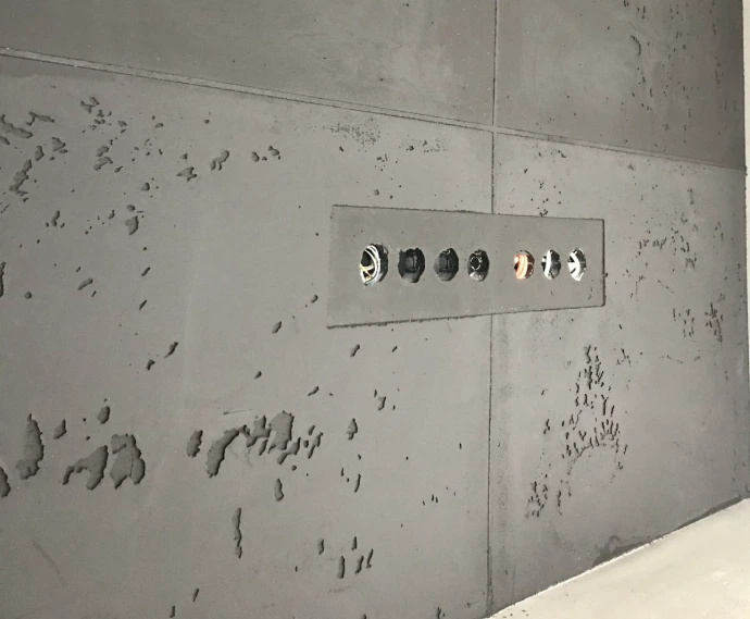 Effet Béton Banché : Reproduction de l'aspect "coffrage industriel" avec ses banches et ses trous de serrage. Idéal pour un look loft/atelier.
