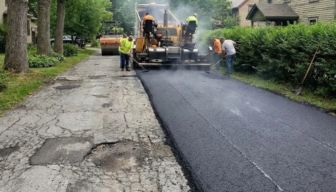 Rénovation par recouvrement : Mise en œuvre d'un nouveau tapis d'enrobé (surfaçage) directement sur l'ancien revêtement préparé. Cette technique permet de redonner une épaisseur d'usure neuve et de renforcer la structure sans démolition.