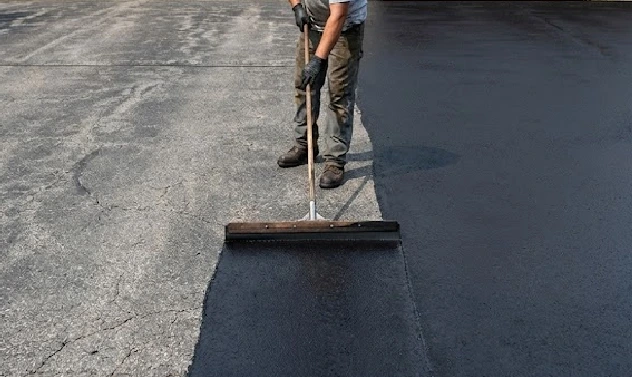 Protection de surface : Application manuelle d'un enduit de scellement à la raclette en caoutchouc par passes croisées. Cette méthode force le produit dans les pores de l'enrobé pour un scellement parfait contre l'eau et les UV.