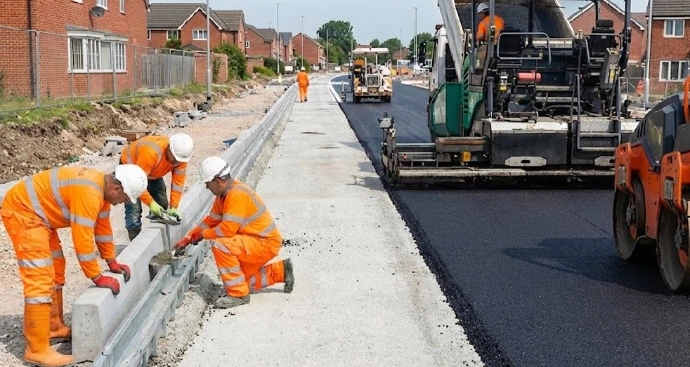 Finitions voirie : Application d'enrobés et scellement de bordures (T2, P1).