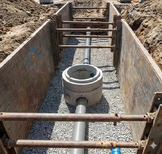 Pose des canalisations pour les eaux usées (EU) et pluviales (EP), installation des regards de visite, boîtes de branchement et siphons.