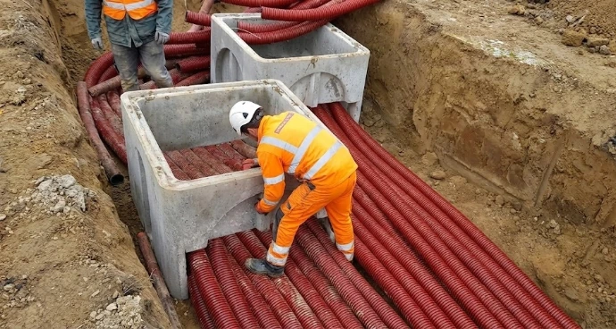 Ouverture de tranchées mutualisées pour la pose des fourreaux et gaines (électricité, télécom, fibre optique, éclairage public) avec grillage avertisseur.